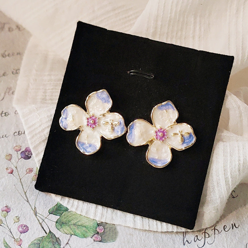French Style 14k Gold Enamel 4-Petal Flower Stud Earrings (5 Pairs)