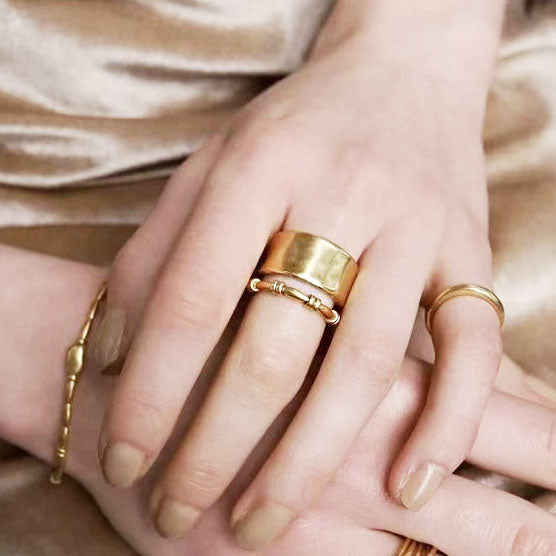 Embrace the timeless sophistication of French style with our exquisite set of five two-layered open rings. Meticulously crafted from high-quality brass, these rings are designed to offer a chic, stacked appearance with the simplicity of a single, comfortable piece. The design features a bold, wide band elegantly paired with a delicate, beaded layer, creating a beautiful contrast in texture and form.