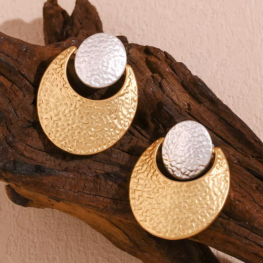 The Big Stainless Steel Two-Tone Hammered Earrings are a bold and artistic statement piece. Combining silver circle and gold crescent moon elements, these earrings feature a striking two-tone design. The geometric shapes are enhanced by a hand-hammered texture, giving them a handcrafted and organic appeal. Perfect for those who want to add a touch of elegance and character to their style.