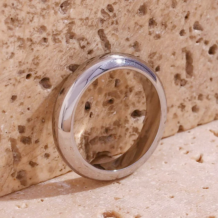 The simple and elegant silver stainless steel band ring resting on a textured stone surface.