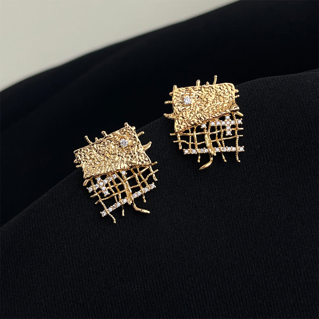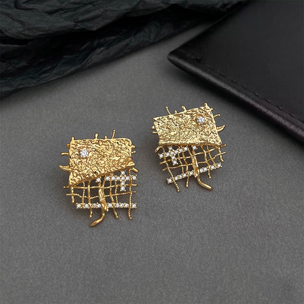 Elegant gold-plated brass geometric statement earrings with sparkling zircon accents.