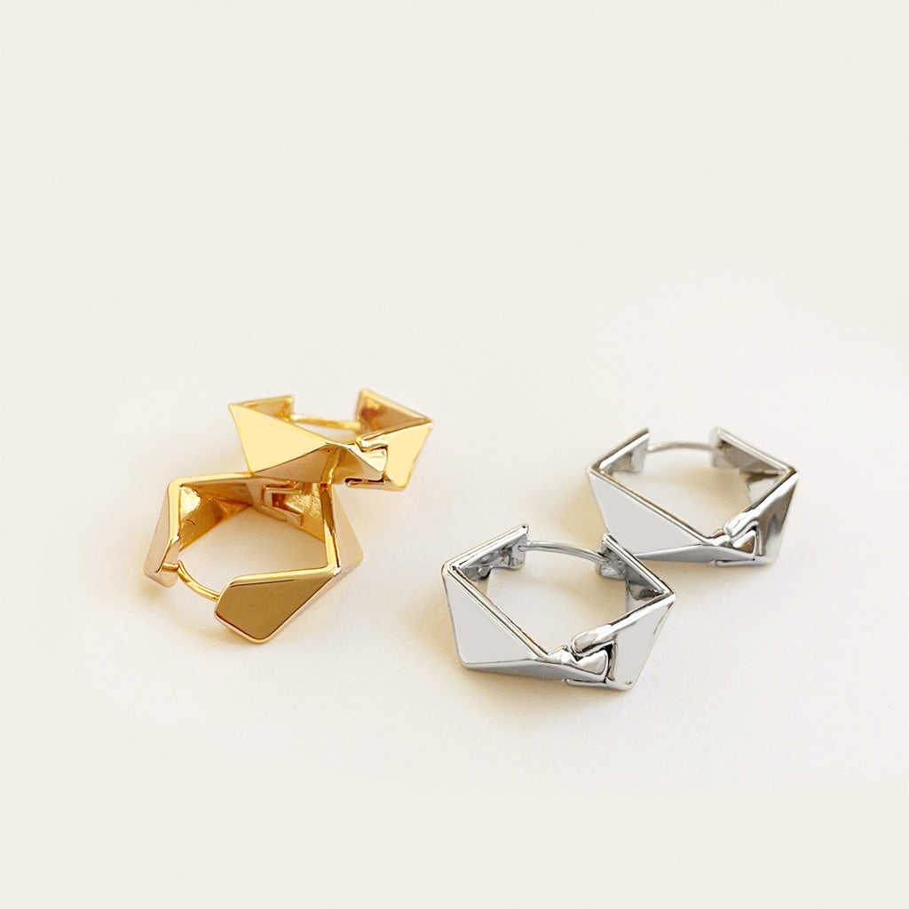 - A pair of gold and a pair of silver geometric hoop earrings displayed side-by-side.