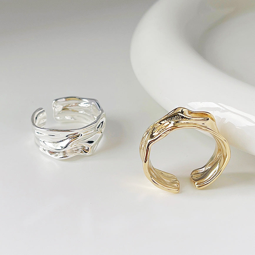 Close-up shot of the silver irregular pleats open ring, showcasing its unique wavy design.