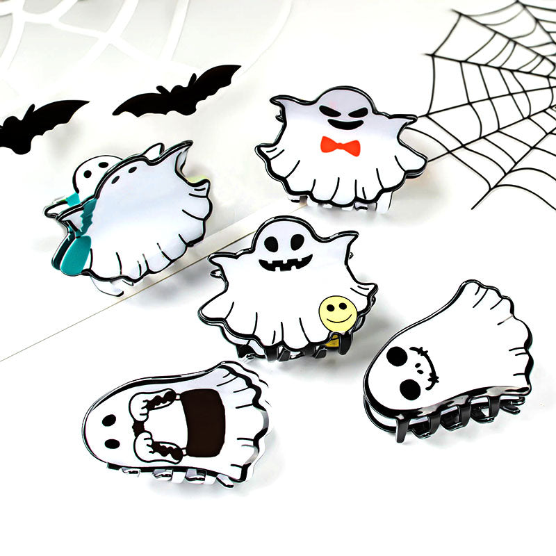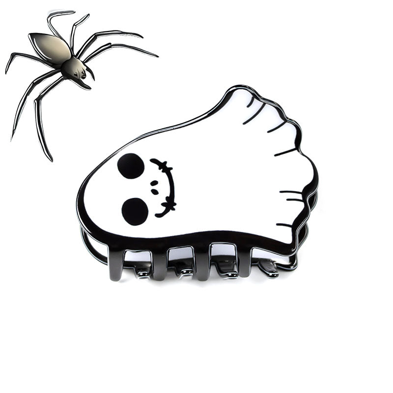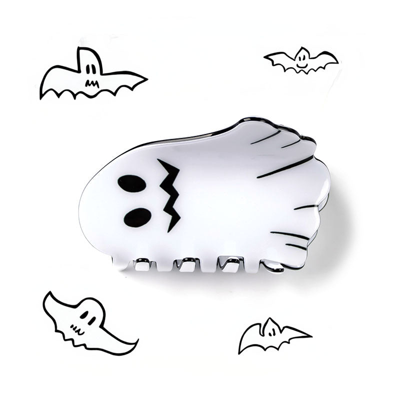 A detailed product shot of a ghost hair claw clip, perfect as a festive Halloween accessory.