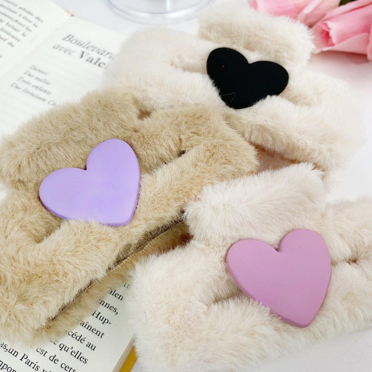 An assortment of fluffy hair clips with heart decorations in pink, purple, and black.