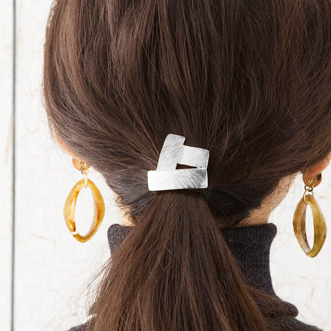 Close-up of the silver geometric stainless steel hair tie securing a woman's ponytail.
