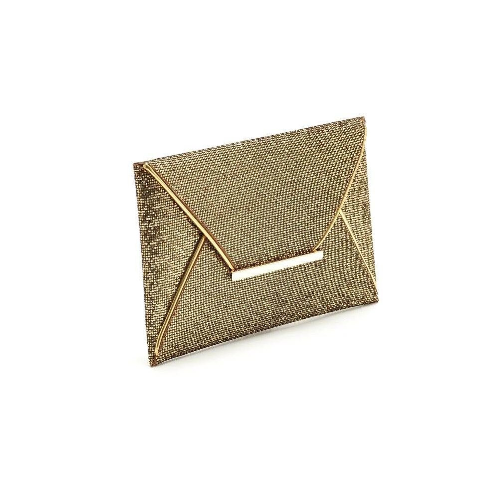 Close-up view of the gold clutch purse showing its textured surface and metal clasp.