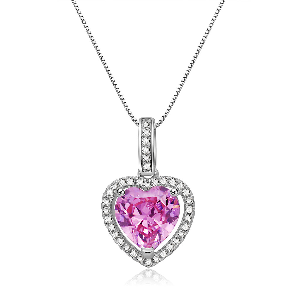 - Detailed view of the silver heart pendant with a pink gemstone and surrounding white stones.