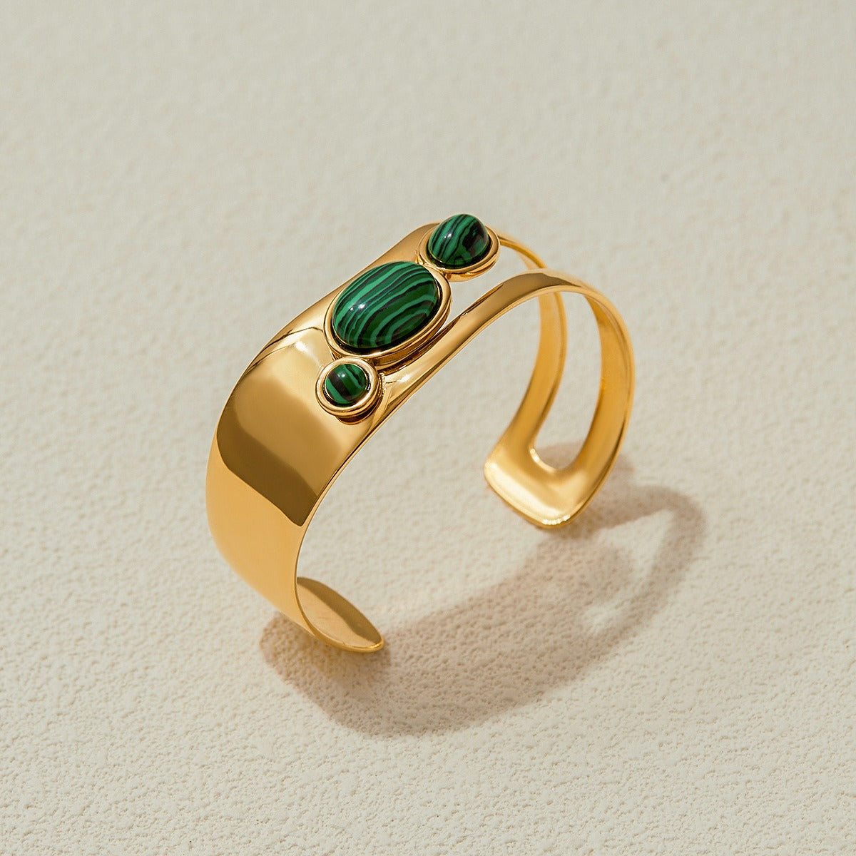 Detailed view of a single gold open bangle bracelet with three natural green malachite stones.