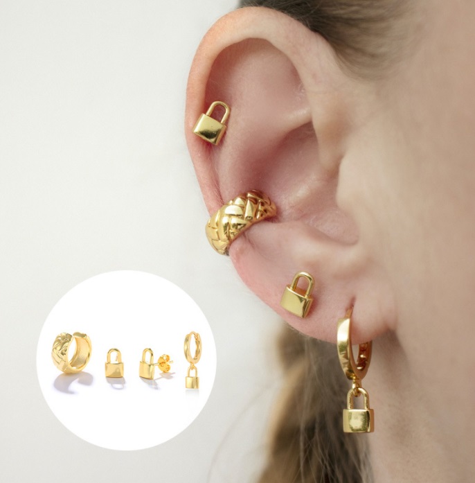 - Close-up view of the gold padlock and hoop earrings on an ear.