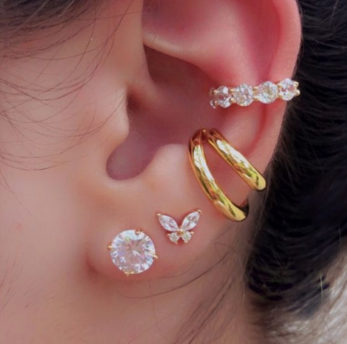 - Close-up view of the gold mini earring collection on a model's ear, displaying the intricate details and sparkle.