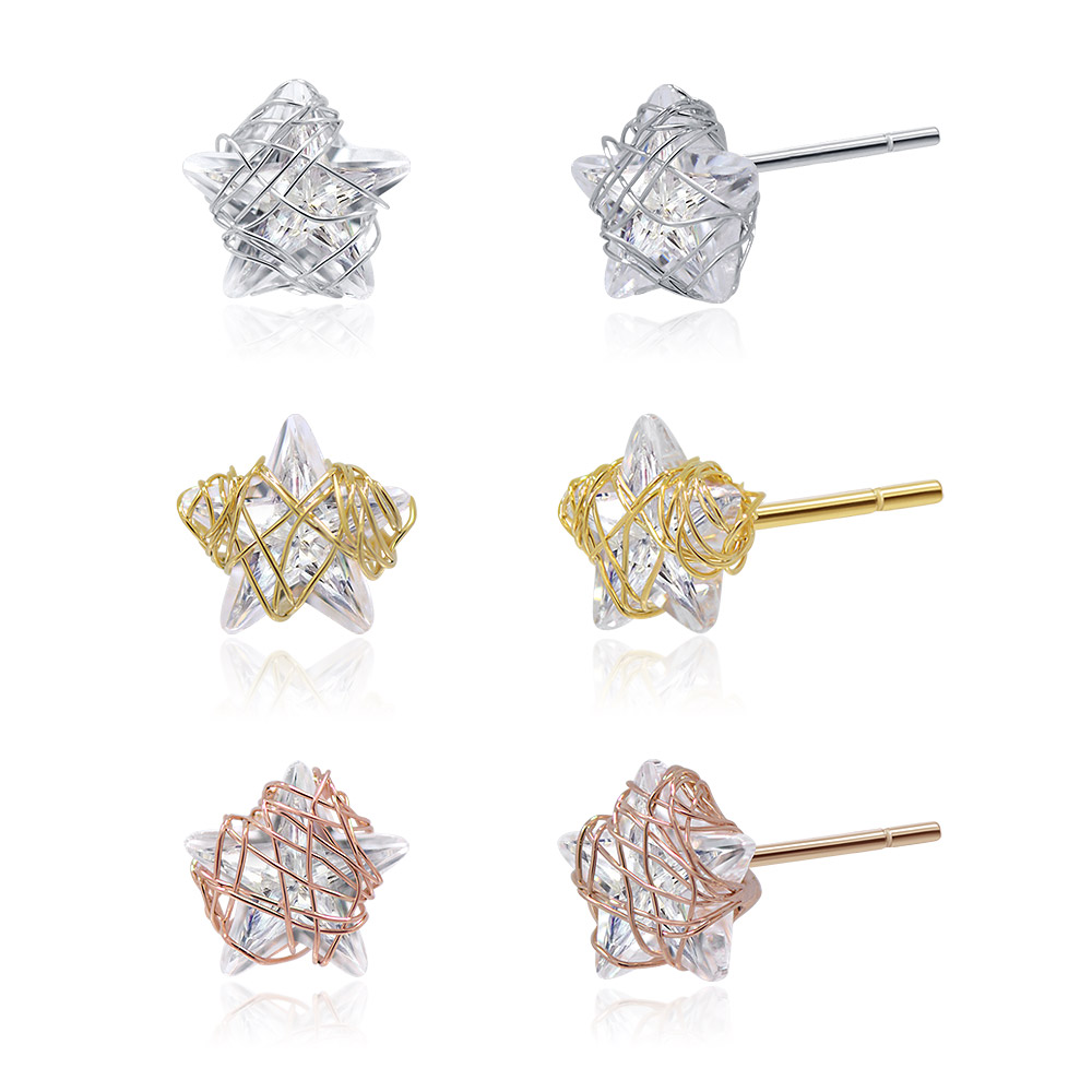 Detailed view of the tri-tone star CZ stud earrings, showcasing the intricate metal lattice design.