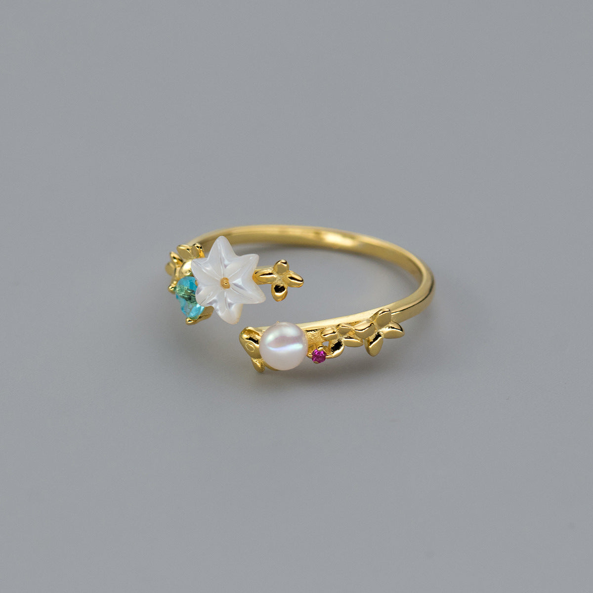 This set of five gold-plated sterling silver rings is a testament to fine craftsmanship and contemporary design. Each ring in the set boasts a unique combination of elements like pearls, floral motifs, and colorful gemstones, making the collection both cohesive and diverse. The adjustable open-band design caters to a wide range of customers, eliminating the need for precise sizing. These rings are perfect for daily wear, special occasions, or as a thoughtful gift.