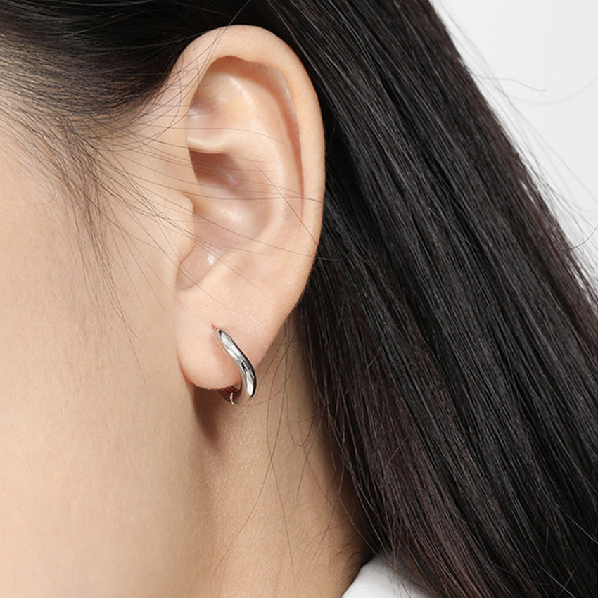 Close-up of a model wearing the hypoallergenic 925 sterling silver version of the minimalist hoop earrings.