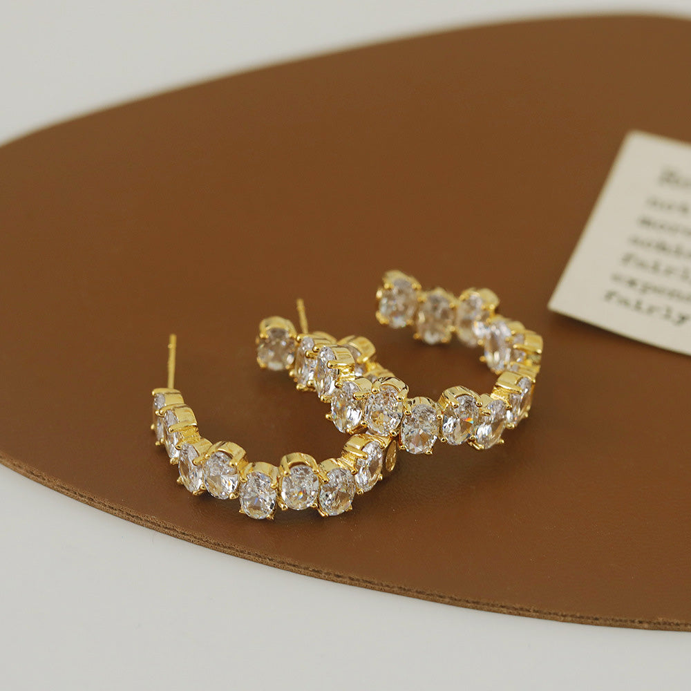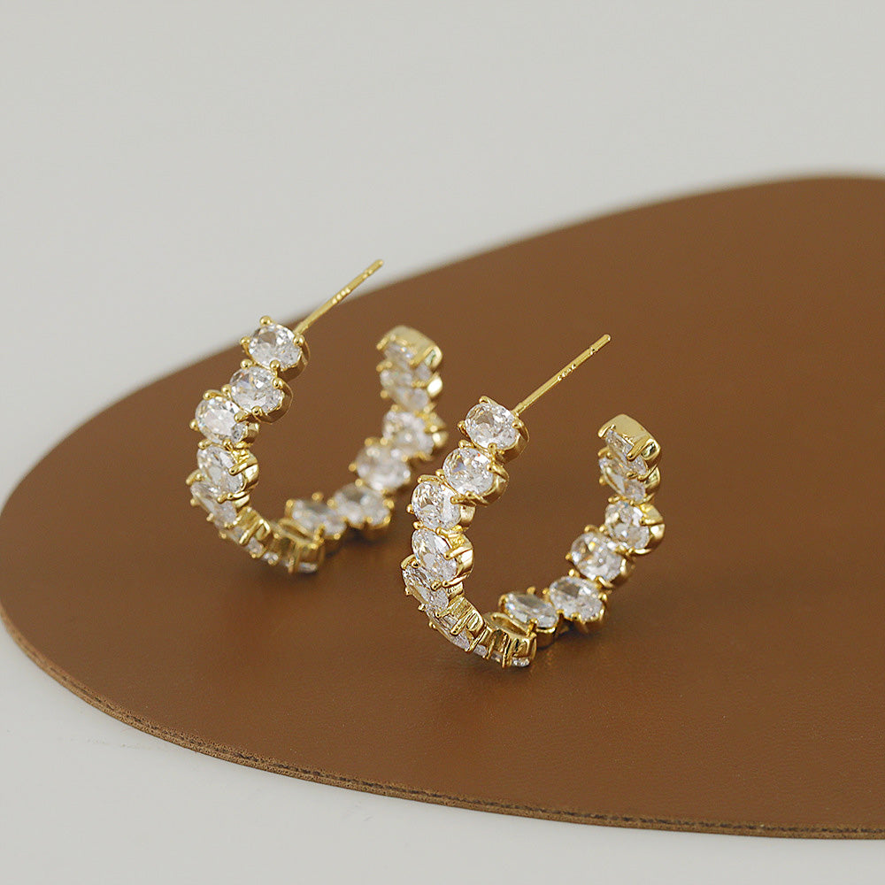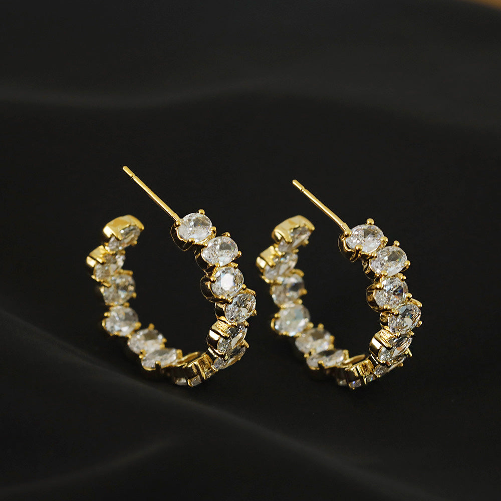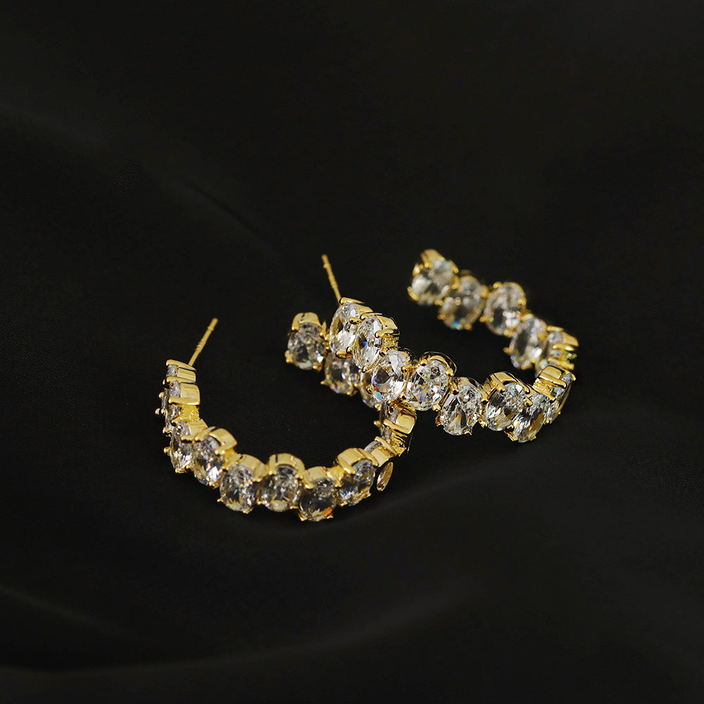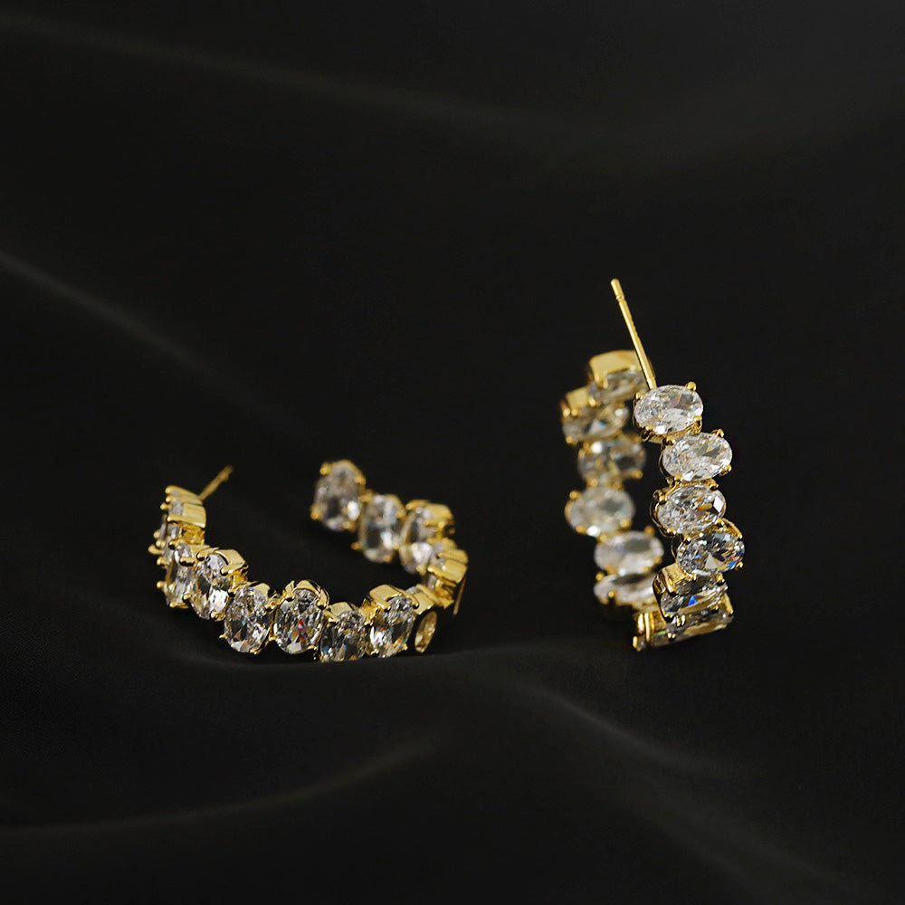 The highlight of these earrings is the array of brilliant oval-cut Cubic Zirconia stones that are carefully set along the C-shaped hoop. These stones capture and reflect light beautifully, offering the luxurious look of real diamonds at an accessible price point. Their versatile design makes them suitable for both everyday wear and special occasions.