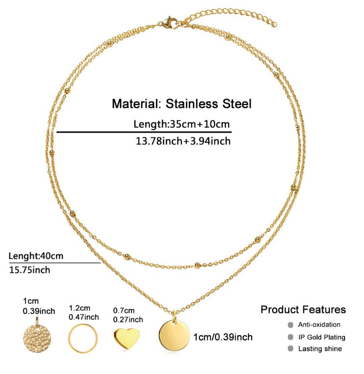 - This Gold Plated Charm Necklace is a testament to fine craftsmanship and contemporary style. The stainless steel construction ensures it is hypoallergenic and resistant to corrosion, while the dual-tone plating provides a versatile aesthetic. It's an excellent choice for fashion brands looking to expand their accessory line with high-quality, affordable pieces.**Ordering Information:** - **Wholesale Orders:** Available for just 10 pieces per design. - **Custom Designs (OEM/ODM):** We can bring your unique vision to life with a minimum order quantity of 100 pieces per design. Our team works closely with you through the entire process, from initial concept to final production. - **Inquiry:** Please use the inquiry form on this page for pricing, custom options, and lead times.