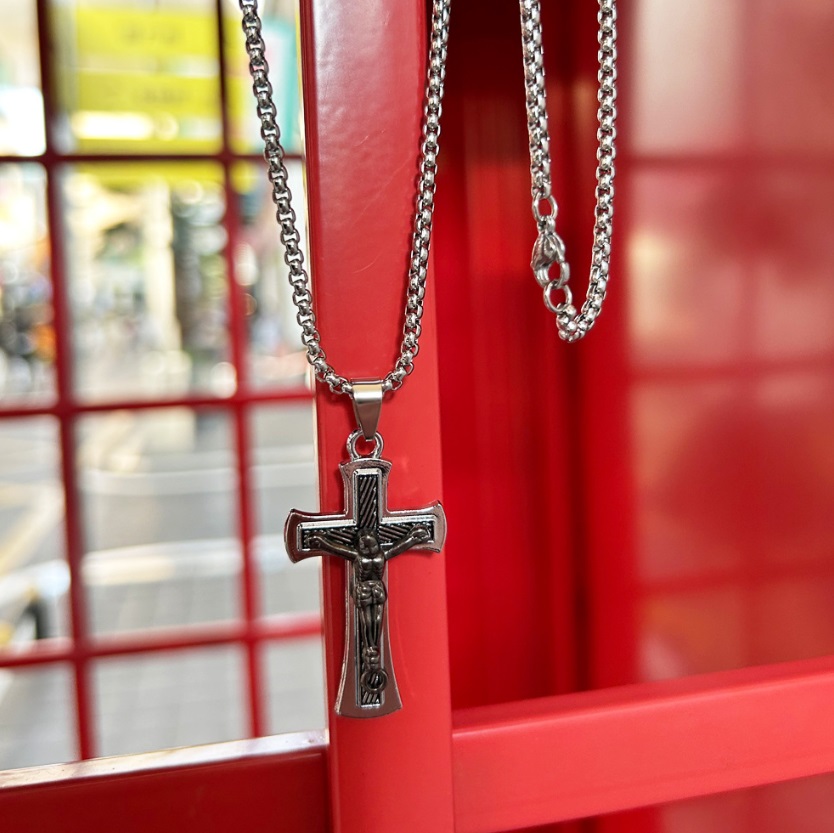 A silver version of the crucifix necklace, showcasing its detailed craftsmanship.