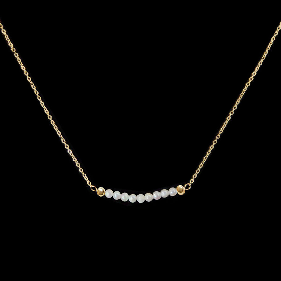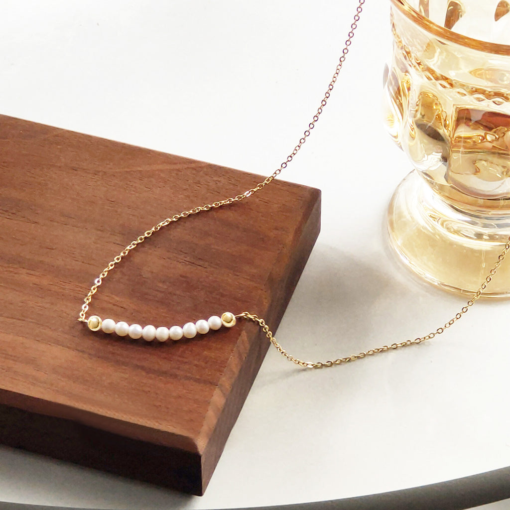 Detailed view of the gold chain necklace featuring lustrous white freshwater pearls.