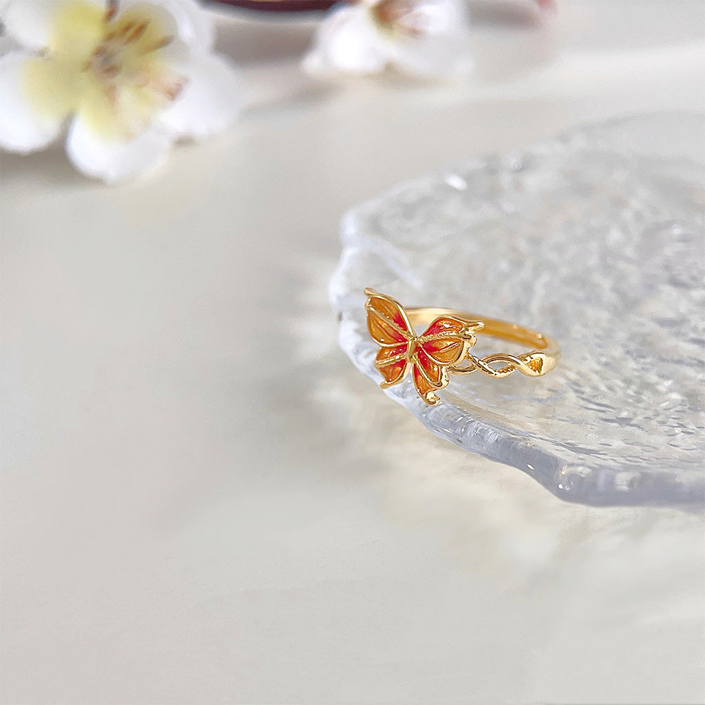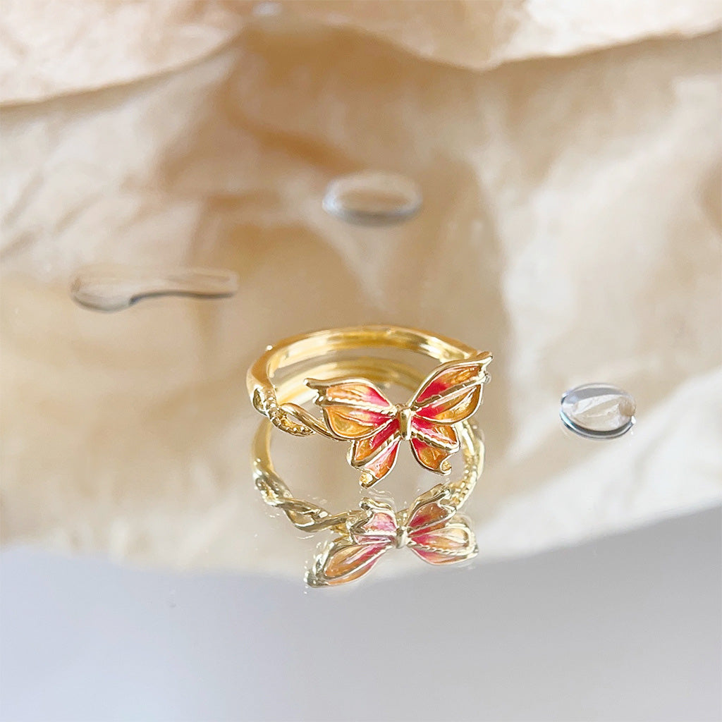 The centerpiece of each ring is the delicate butterfly, whose wings showcase a beautiful gradient of warm orange and rich red tones. This detailed enamel work creates a captivating visual effect that catches the light and draws attention. The adjustable band ensures a comfortable and perfect fit for any finger, making this set a versatile addition to any style.