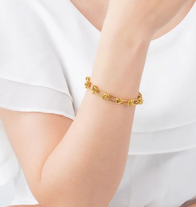 - Model wearing the gold plated stainless steel bracelet to show its fit and style.