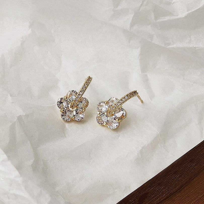 - Top-down view of the gold-plated flower earrings showcasing the zircon crystal details.