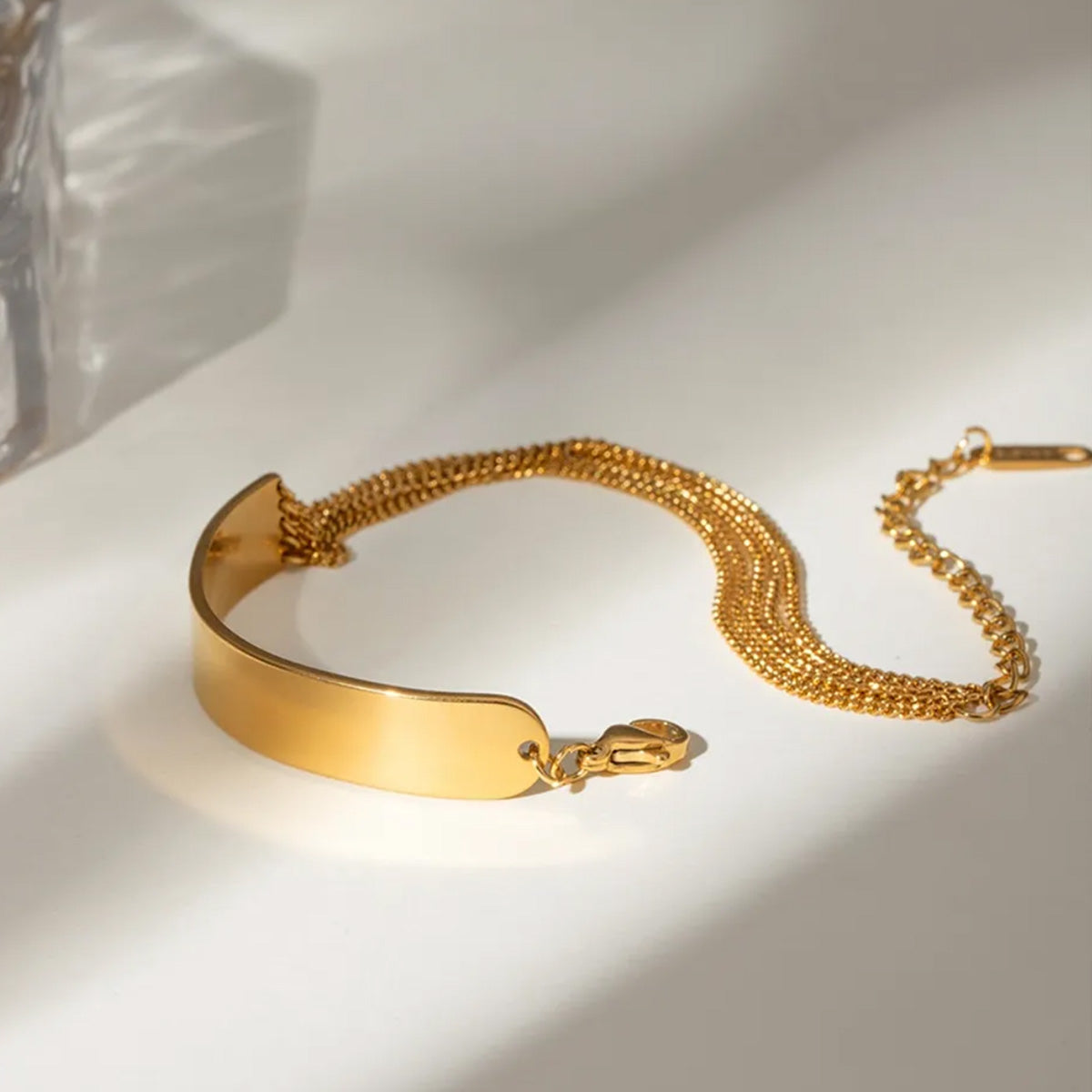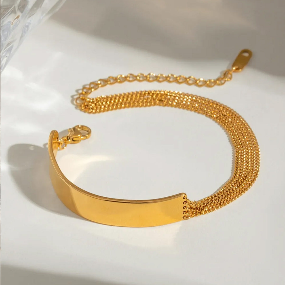 Close-up of a gold stainless steel bracelet with a flat plate and multi-strand chain design.