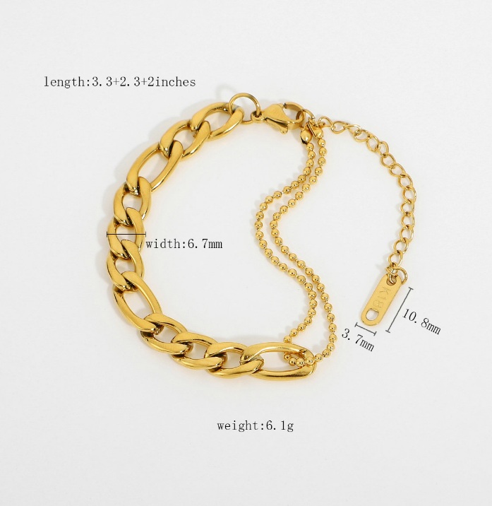 - Detailed measurements of the Gold Thick Link Bracelet, showing length, width, and weight.