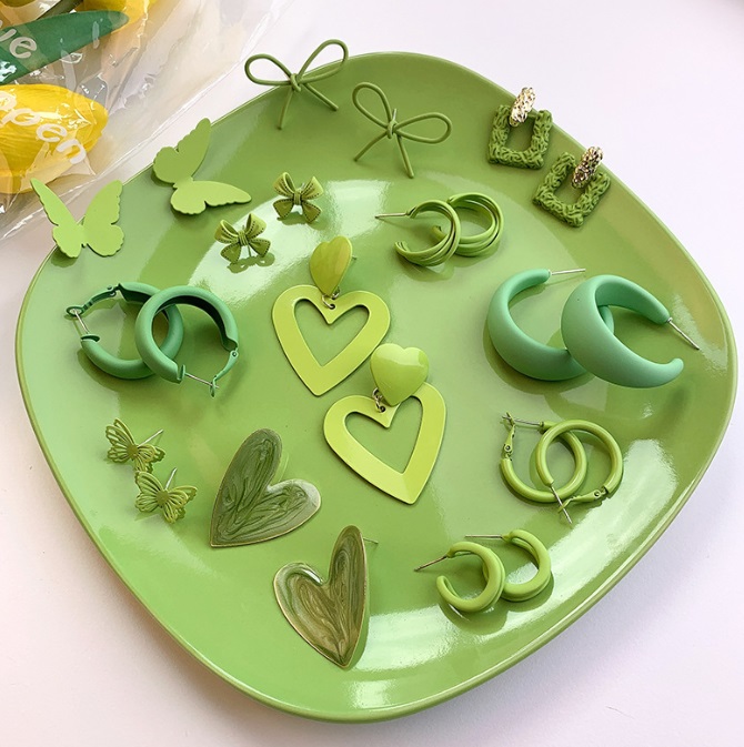 An artistic display of the green enamel earring collection on a heart-shaped plate.