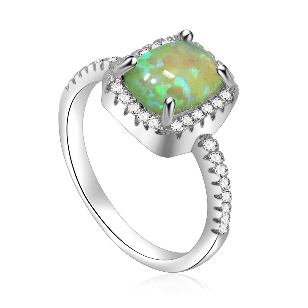 At the heart of this ring lies a dazzling white cubic zirconia, encircled by a stunning 9*7 mm green opal glass accent. The interplay of the fiery opal and the sparkling CZ creates a mesmerizing "burst" effect that is sure to draw compliments. The overall dimensions of the centerpiece are approximately 11x10 mm, making it a noticeable yet refined accessory.