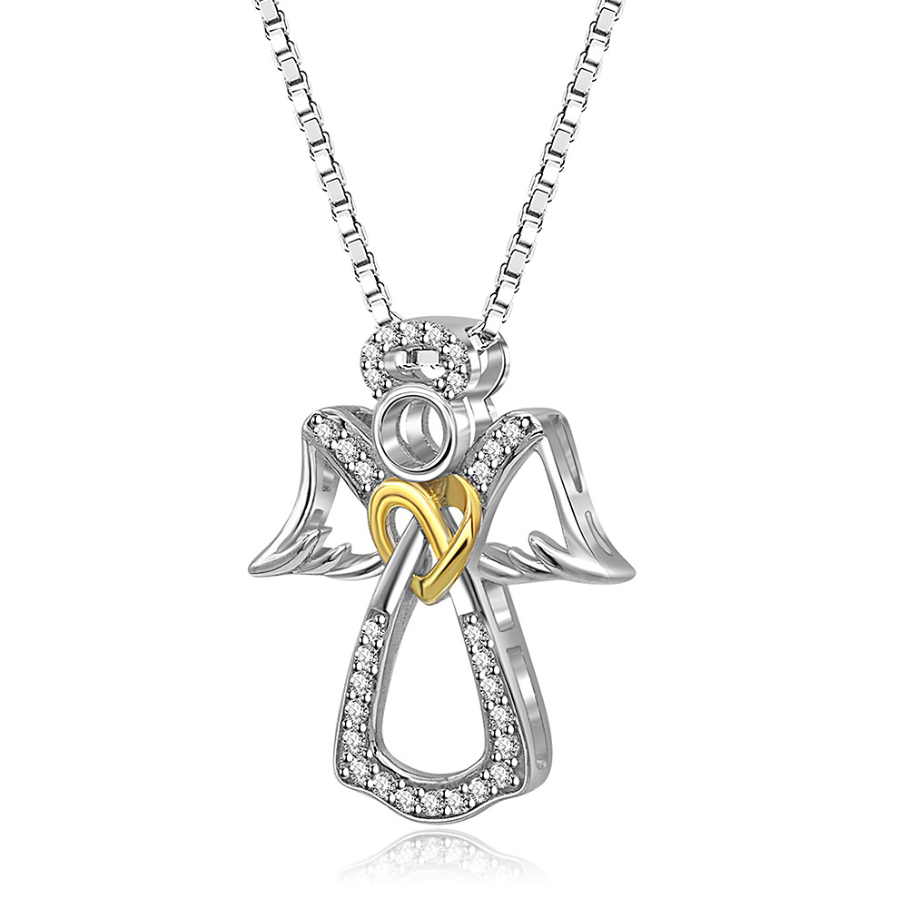 - Close-up of the two-tone angel pendant, highlighting the gold heart element and intricate wing details.