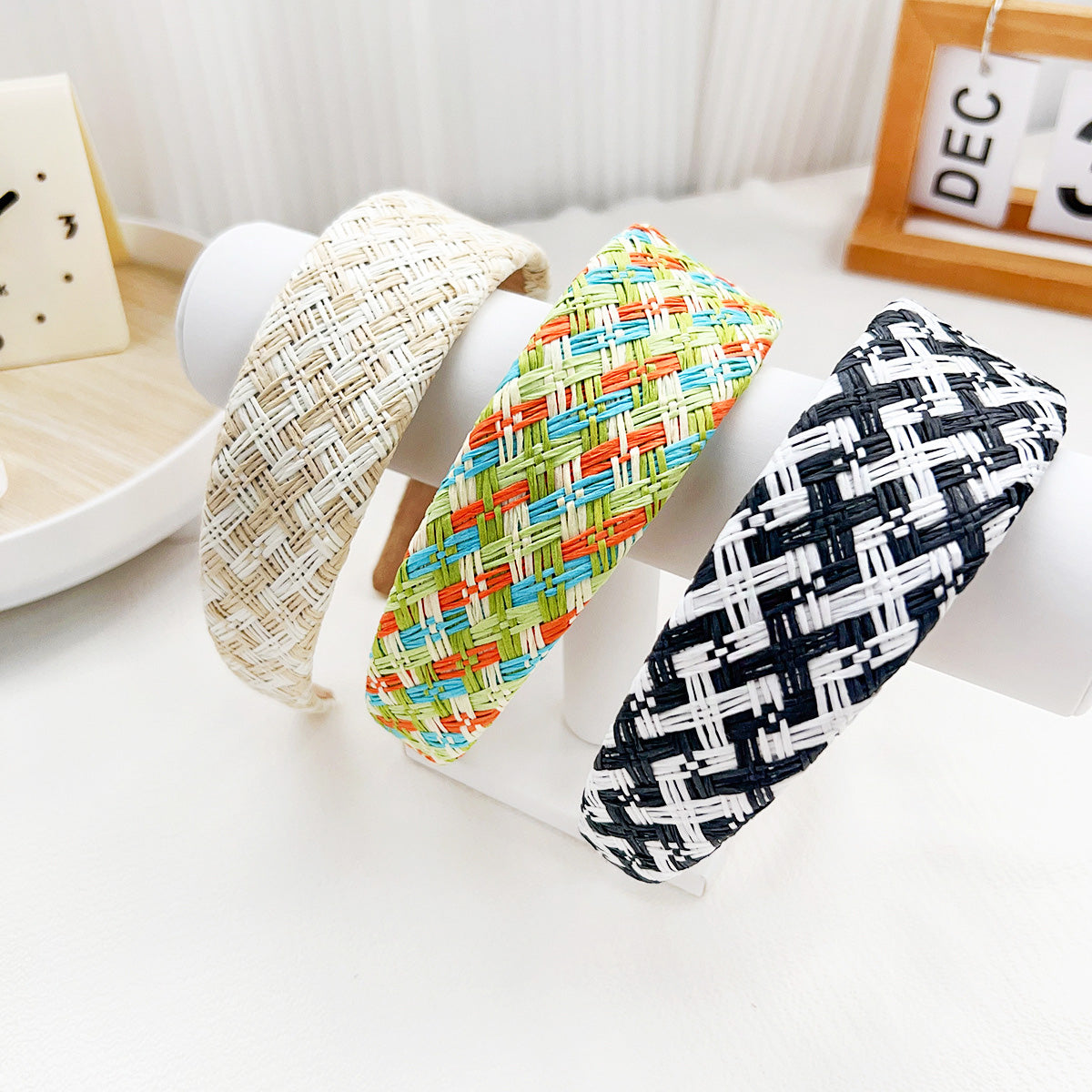 - Three different color variations of the woven raffia headbands on a clean background.