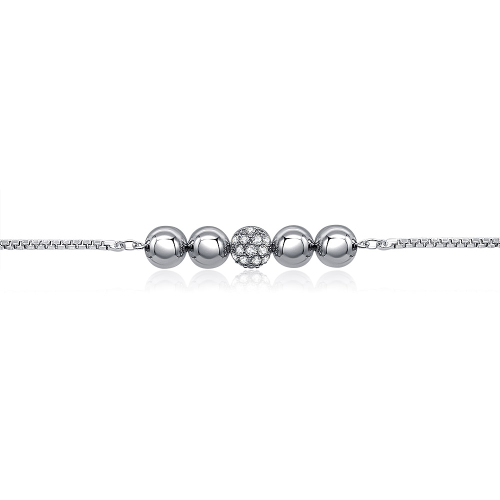 - Angled shot of the silver charm bracelet, focusing on the decorative central ball paved with sparkling cubic zirconia.