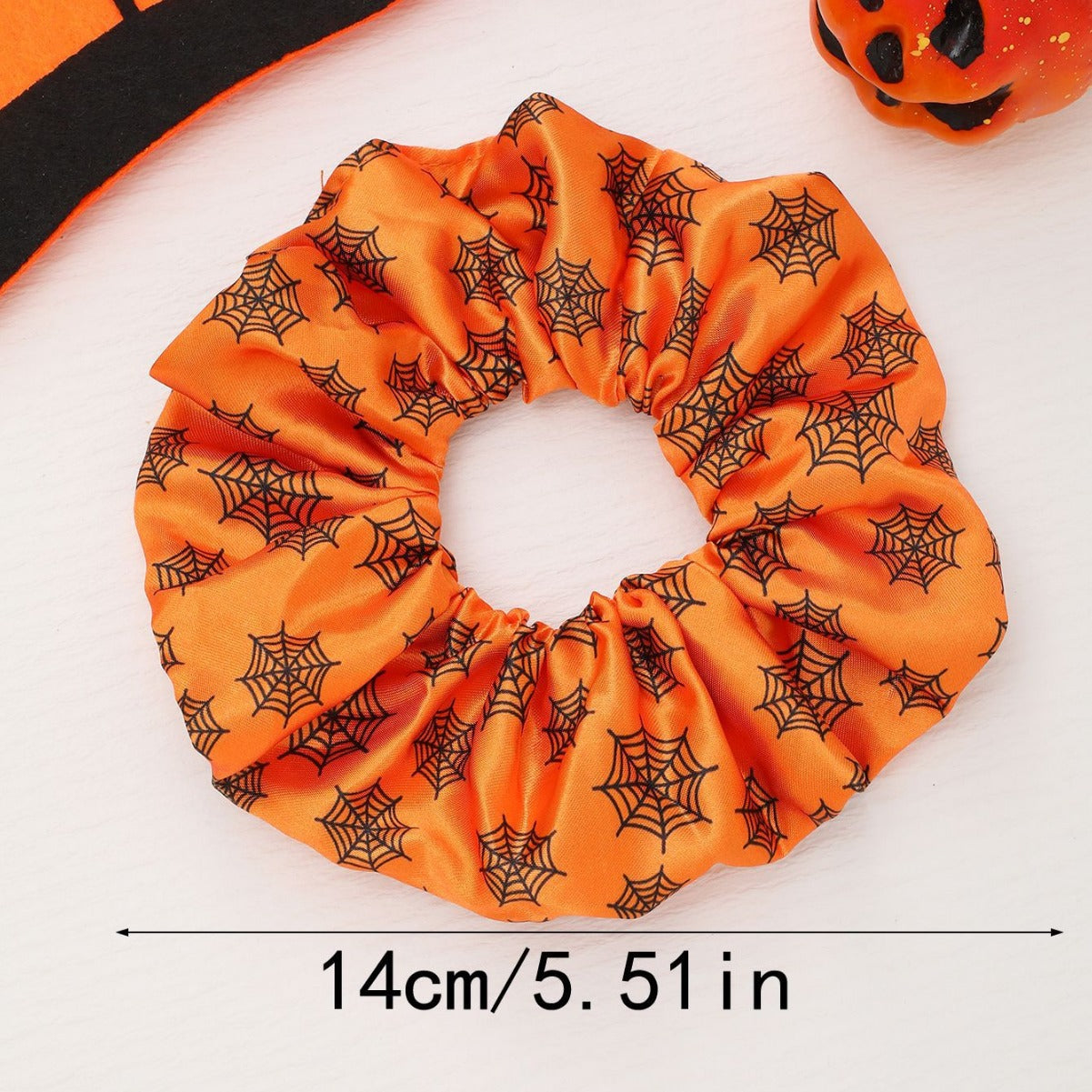 - A bright orange Halloween scrunchie with a classic black spider web design.