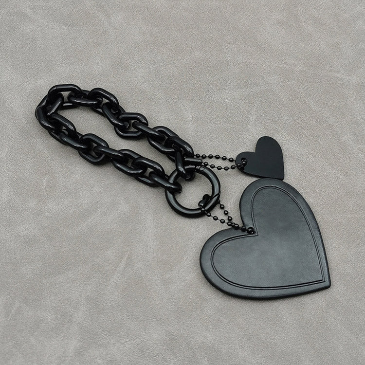 Detailed view of the black heart-shaped bag charm showcasing its texture and metal chain.