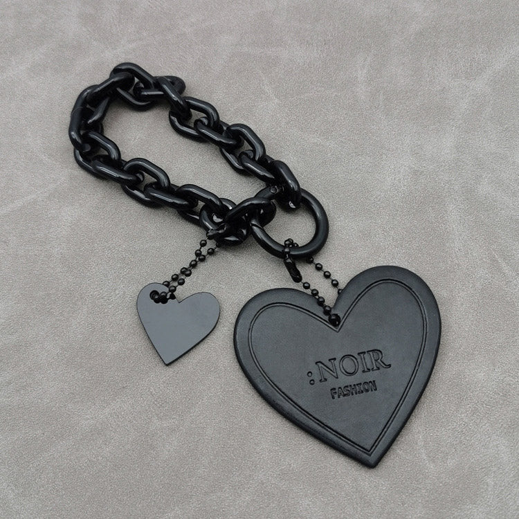 Close-up of the black PU leather heart charm with custom 'NOIR FASHION' logo embossing.