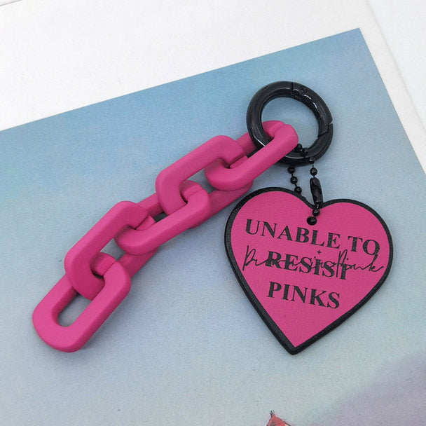 Vibrant pink PU leather heart keychain with a playful 'UNABLE TO RESIST PINKS' message.