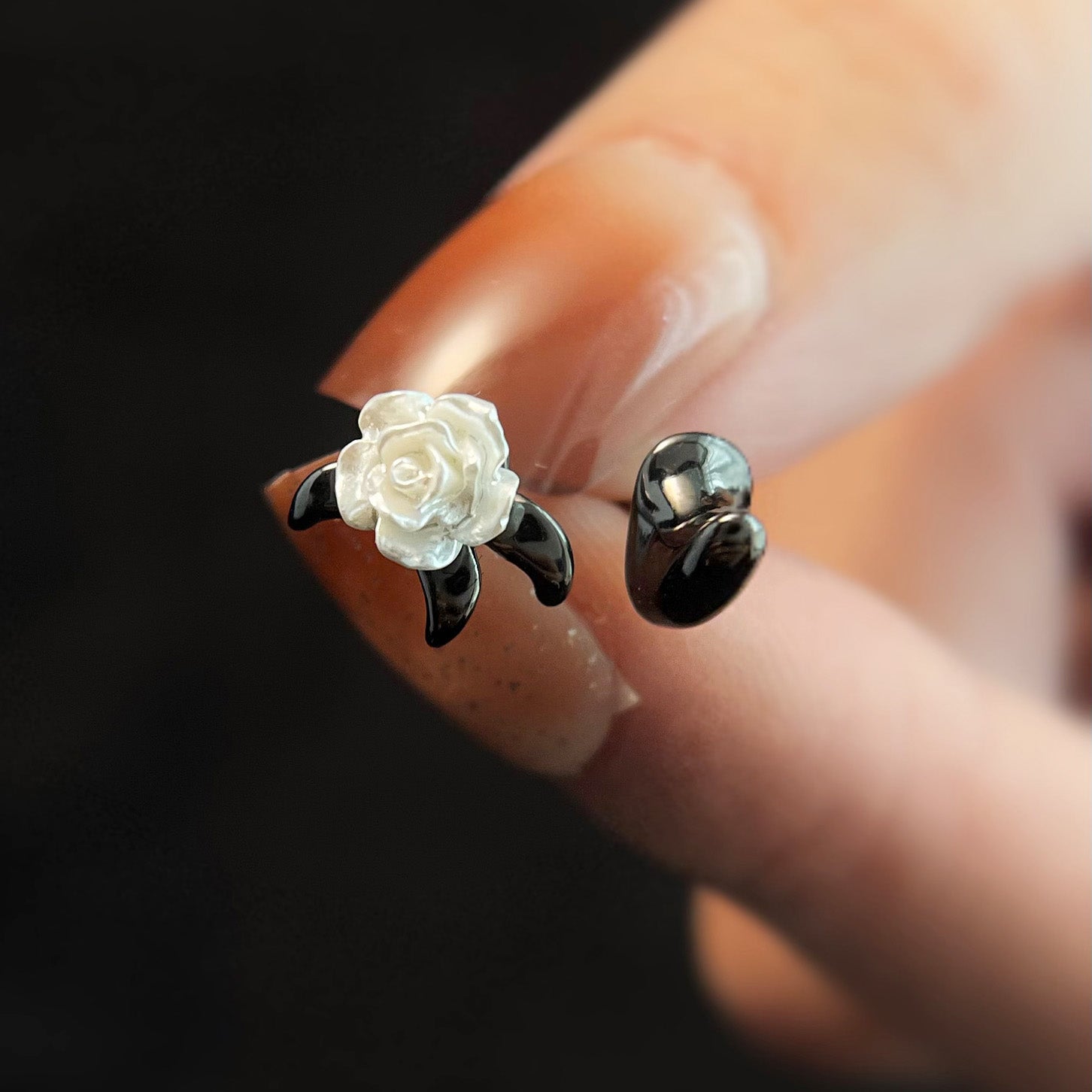 Introducing our beautifully crafted handmade asymmetrical stud earrings, a perfect blend of modern style and classic floral elegance. Each set features a unique combination of a detailed resin and enamel rose flower stud and a complementary simple stud, available in a timeless black and white palette. This design offers a playful yet sophisticated look that appeals to a wide range of customers.