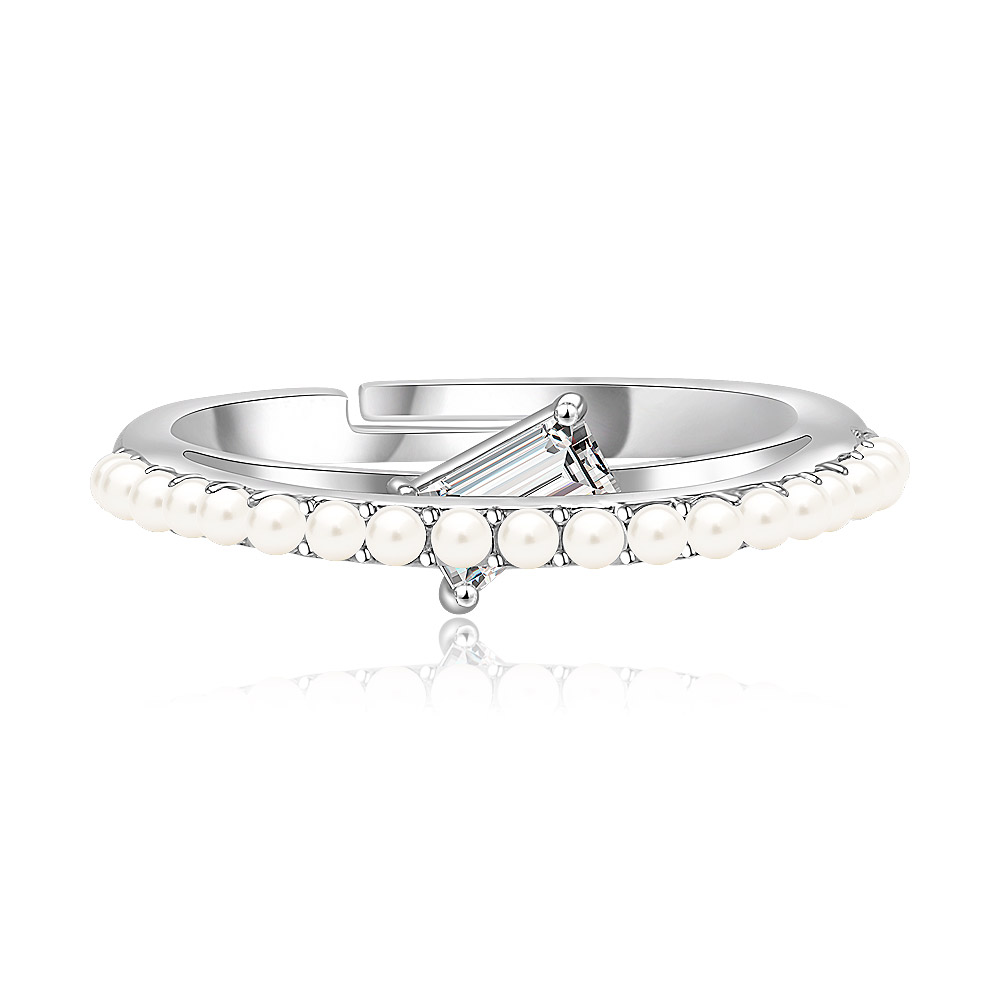 - Detailed view of the High Up Line Pearl CZ Ring, highlighting a brilliant clear gemstone and lustrous pearl embellishments.