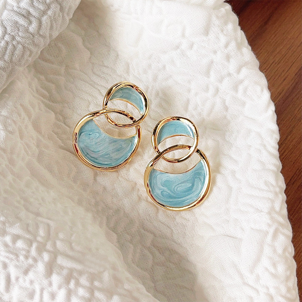 - Design: Modern hollow-out interlocking circles with a beautiful blue enamel inlay.