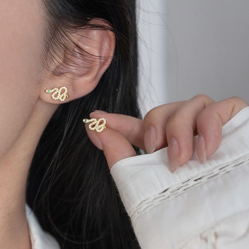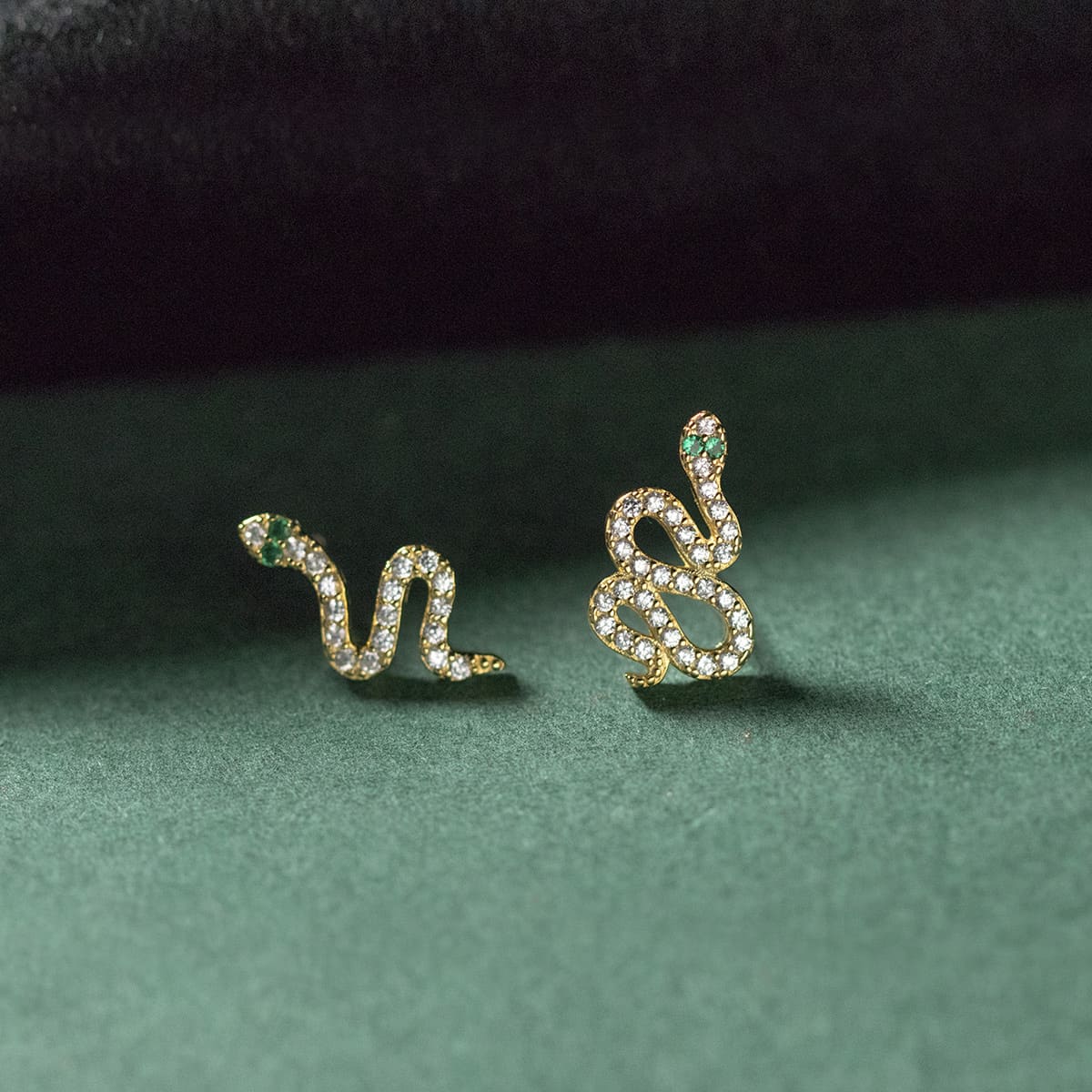 - Elegant gold snake-shaped stud earrings embellished with white stones and vibrant green eyes.