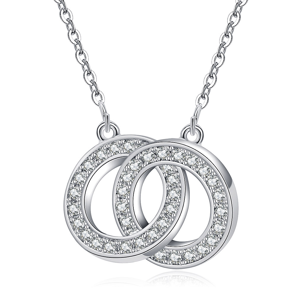 - Close-up of the rhodium-plated interlocking circles pendant, one circle encrusted with brilliant cubic zirconia stones.