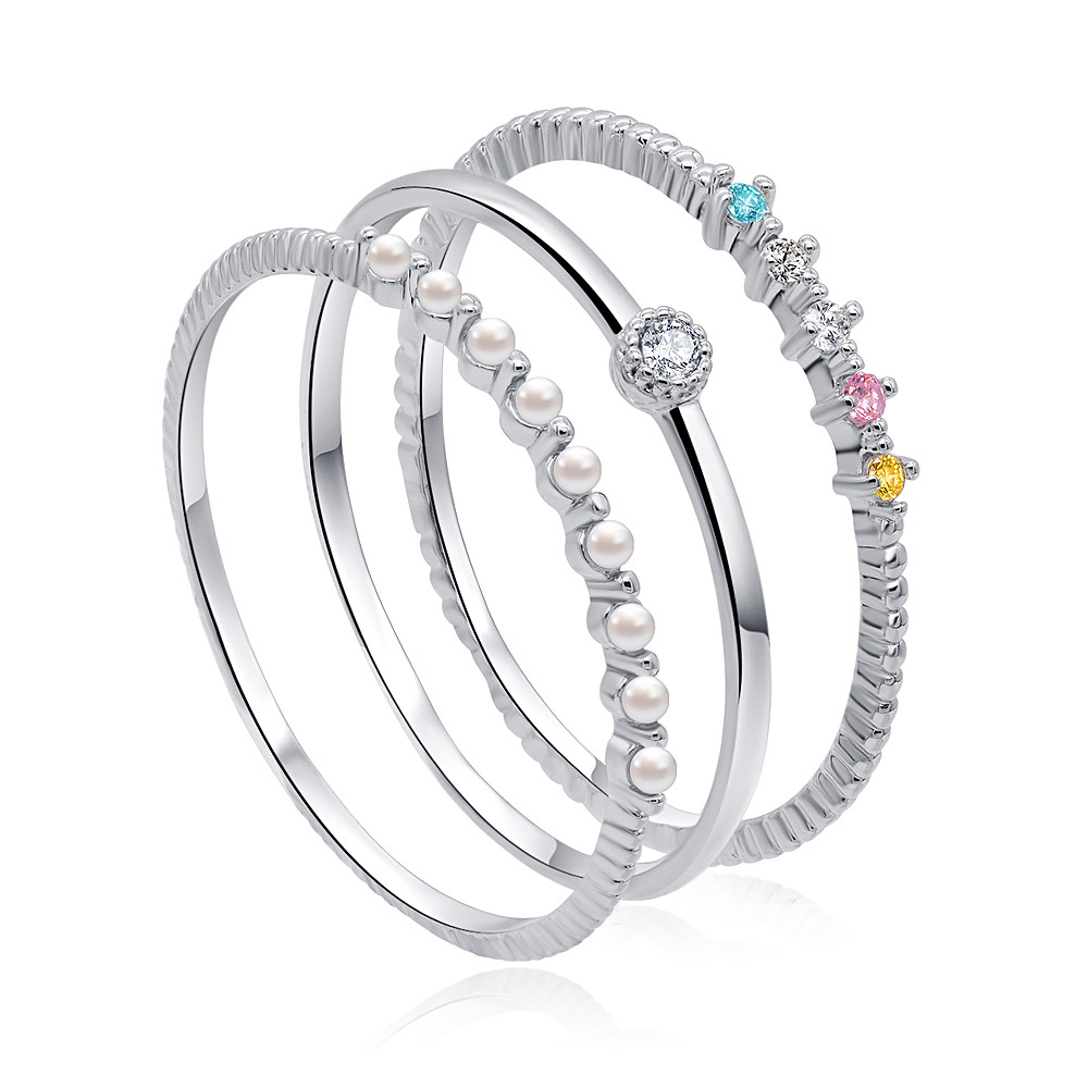 - A close-up view of the three stackable rings, showing the detail of the rhodium plating and the colorful CZ stones.