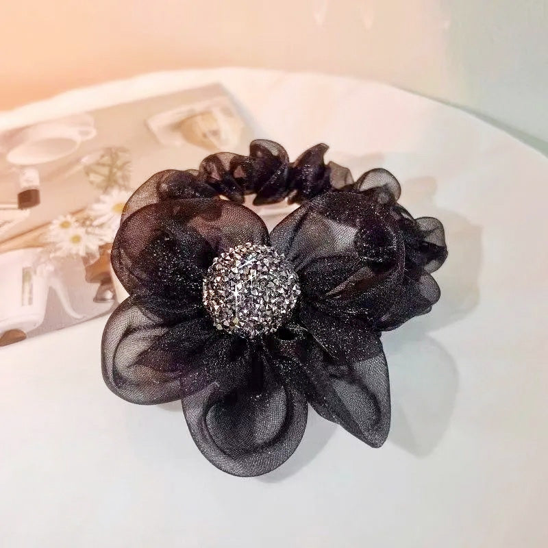 - Detailed view of the black fabric flower scrunchie with a glittery center.