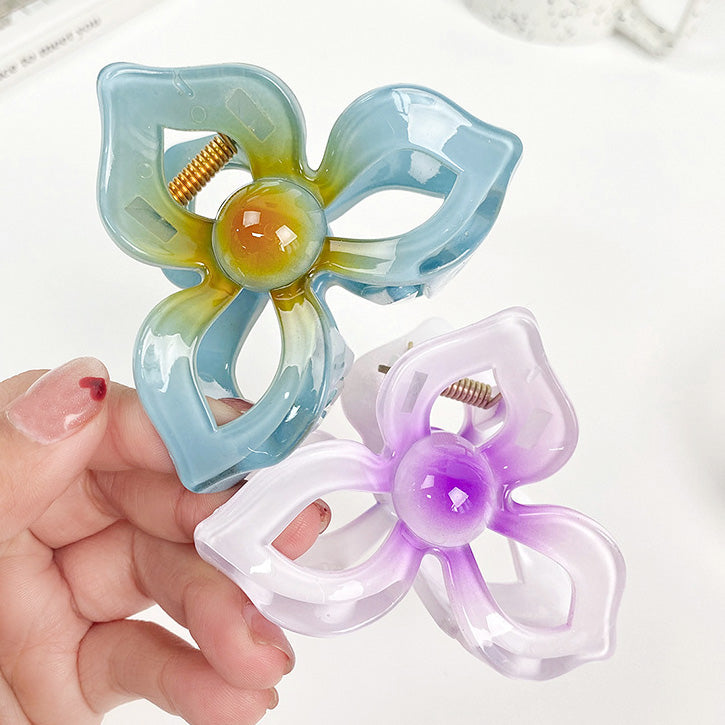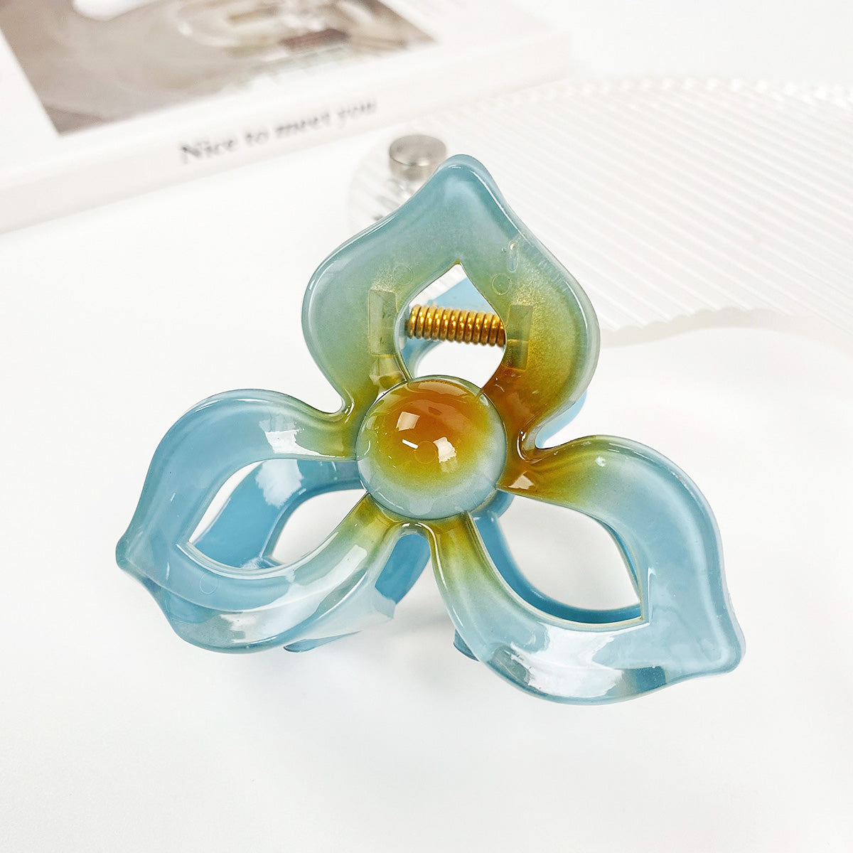 A multi-colored plumeria hair clip featuring shades of blue, green, and yellow.