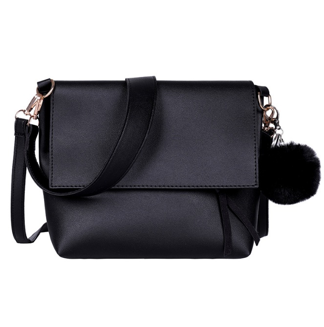 - Front view of the large capacity cross body bag in black PU leather with flap closure.