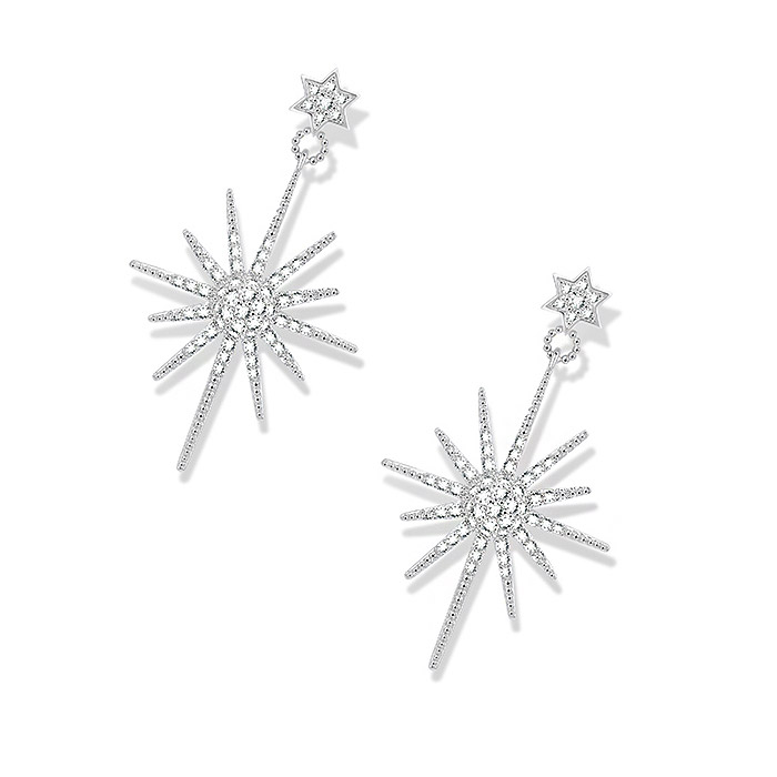 Each earring is meticulously crafted from durable brass with a lustrous rhodium plating. The starbursts are handset with micron-paved, AAA-grade white cubic zirconia stones that sparkle with unmatched fire and brilliance. This combination of quality materials and expert craftsmanship results in a piece of jewelry that is both beautiful and built to last.