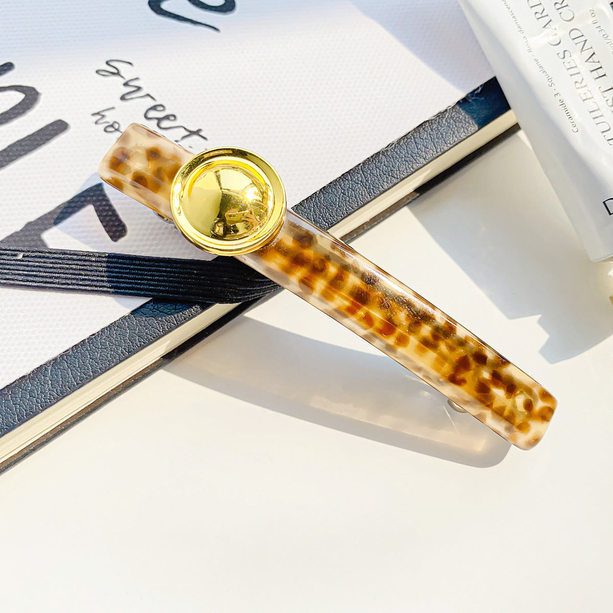 Detailed shot of a tortoiseshell pattern acetate hair clip with a polished gold detail.