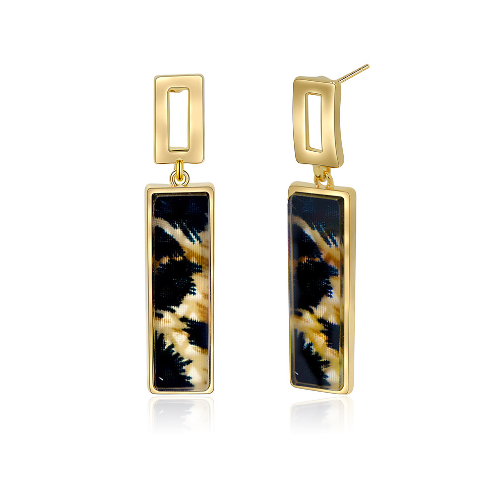- Detailed side view of the leopard print stud earring, highlighting the rectangular black and gold inlaid stone.