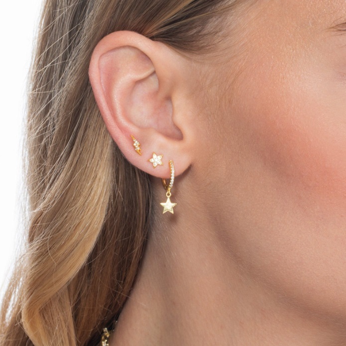 Model showcasing the stylish wear of the gold star and lightning bolt earrings set.
