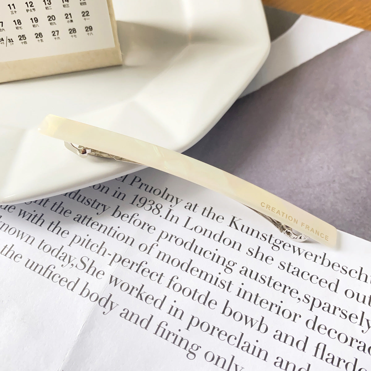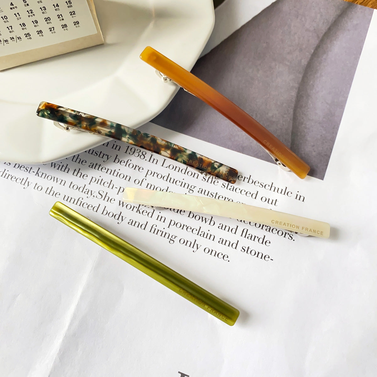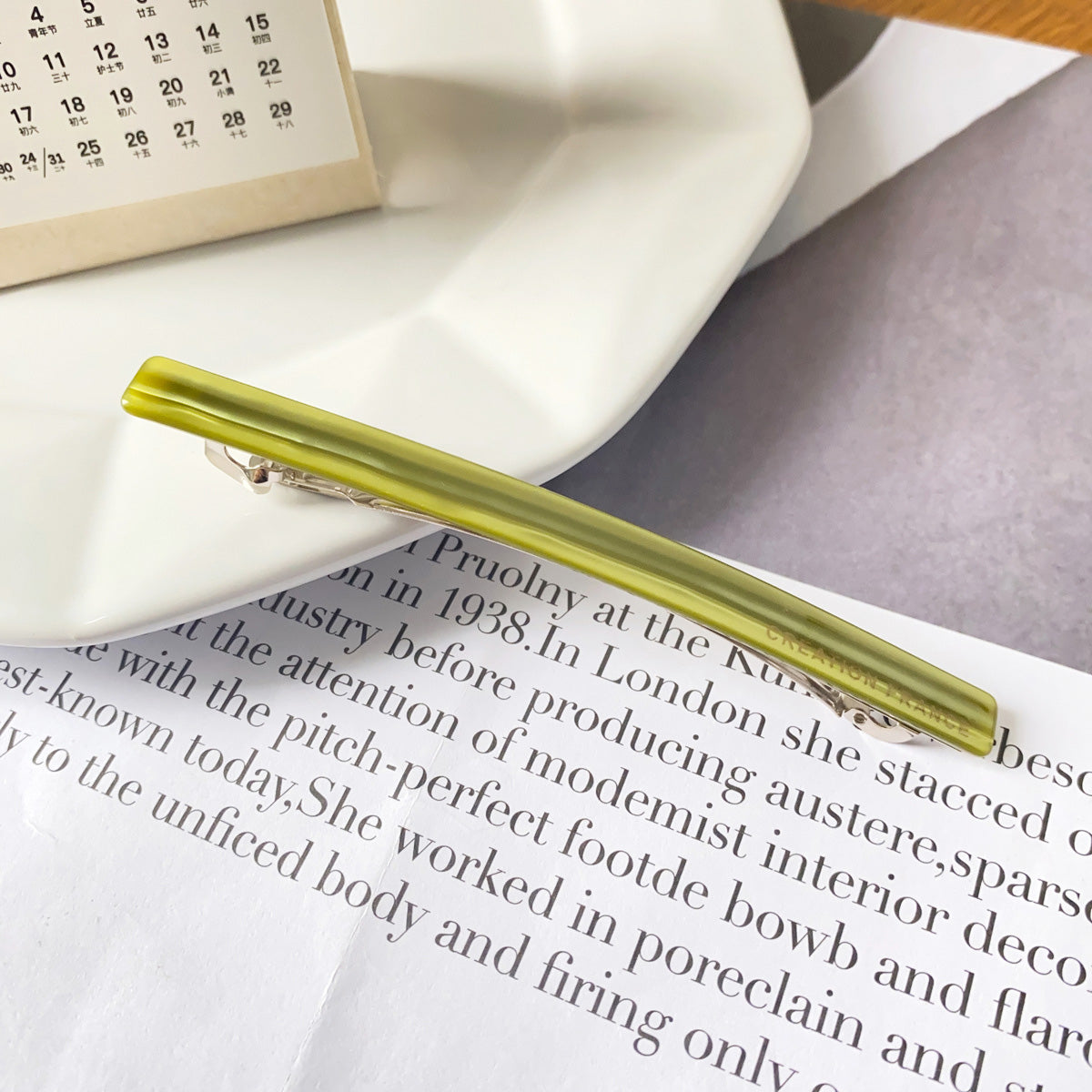 - A stylish green acetate hair clip resting on an open book.